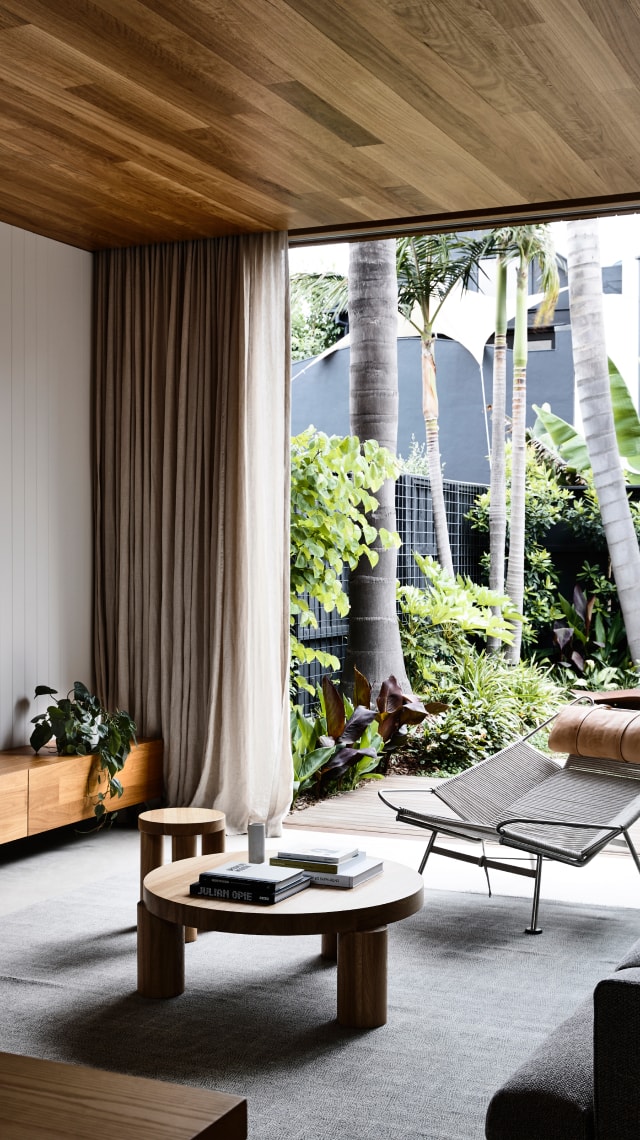 A simple courtyard garden with established self-seeded palm trees provides a lush, evergreen backdrop to the long, narrow site.