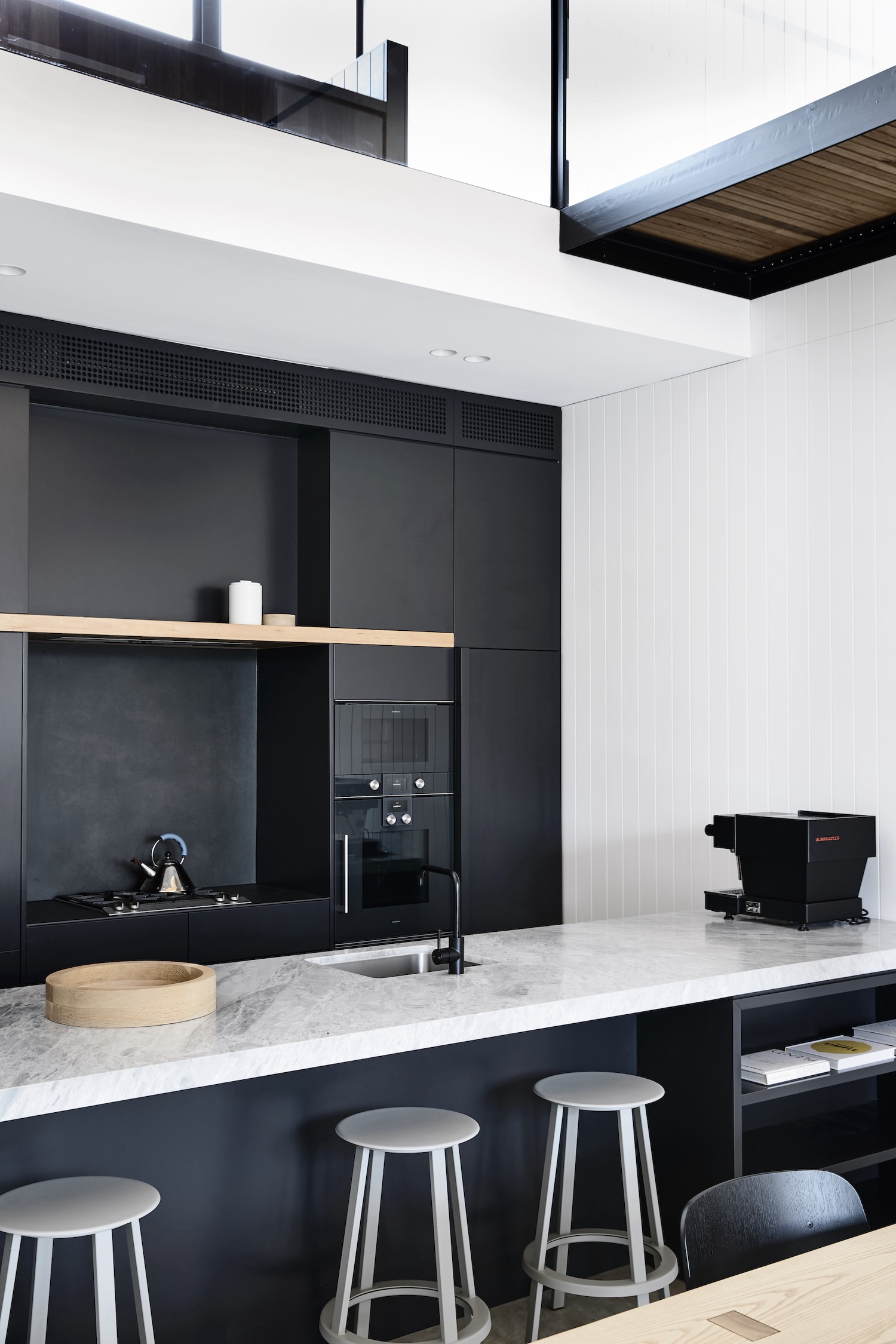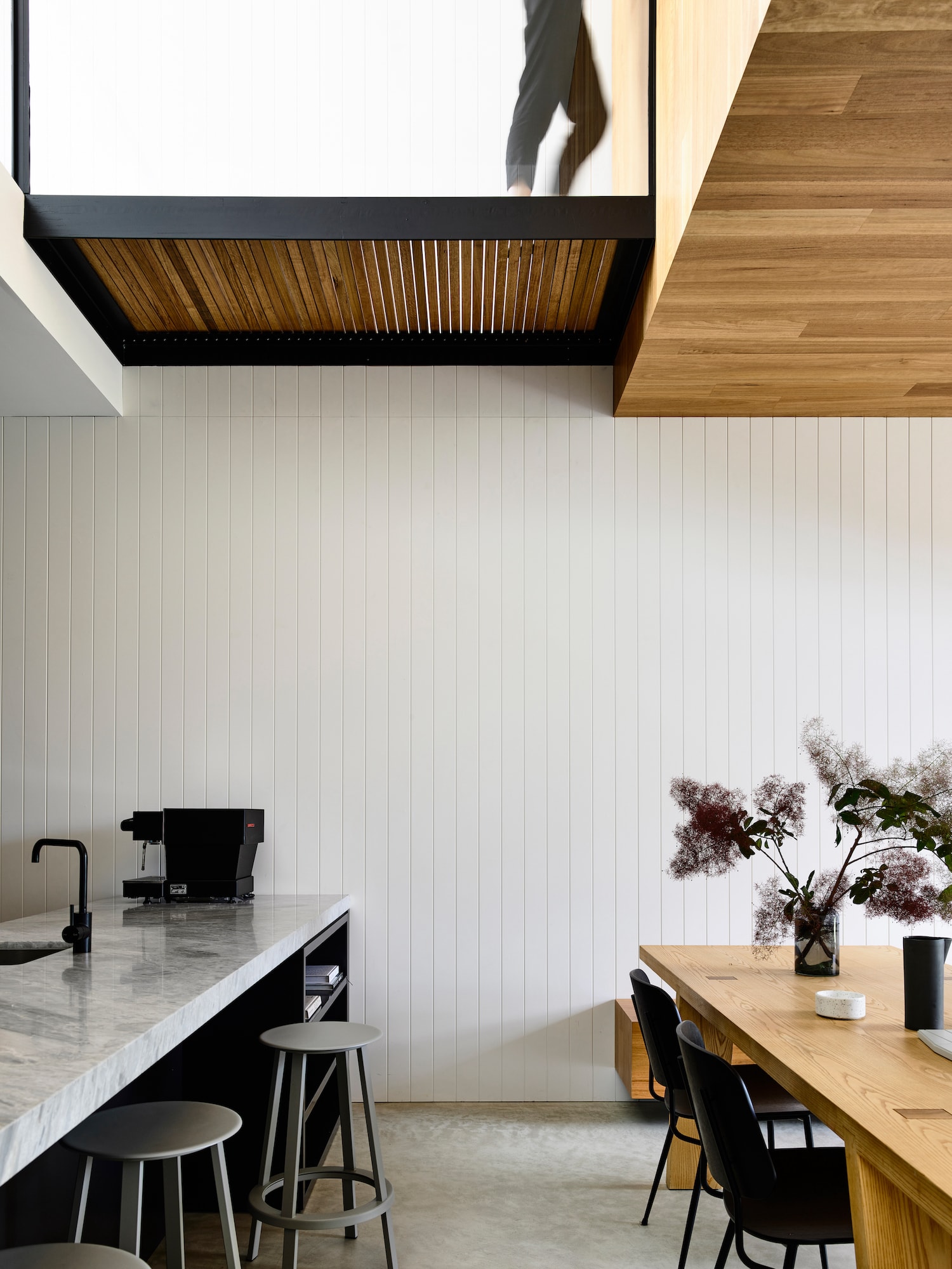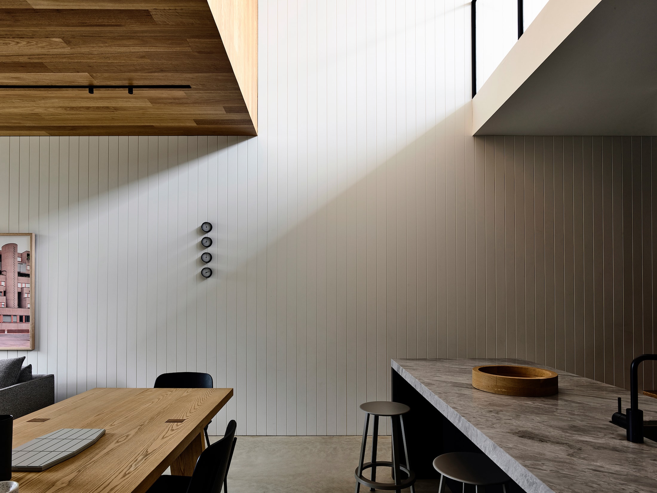 A bold response was devised to the classic challenges of light, ventilation and spatial flow in a Victorian terrace. A double-height void was introduced above the kitchen and dining area, which splits the first-floor volume of the extension in half. One half sees a home office overlooking a large terrace orientated to the north and back towards the street, while the other half, connected by a steel and timber-batten bridge, links the master bedroom suite. The bridge amplifies the physical separation between public and private areas of the house while providing important visual connections to activity in the main living area. The double-height void saturates the living zone with northern light and creates a generous and spatially relieving volume in the kitchen and meals area.