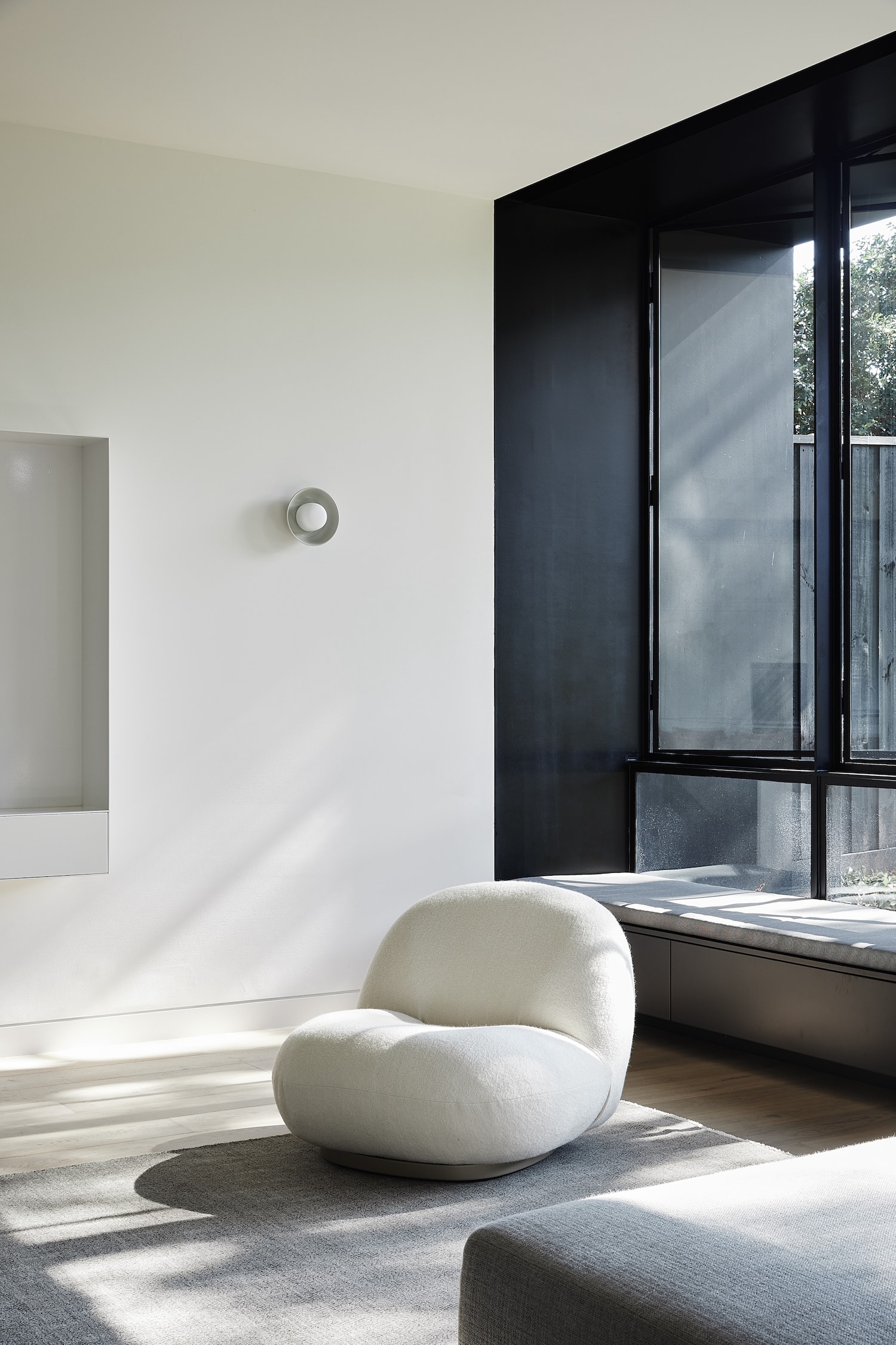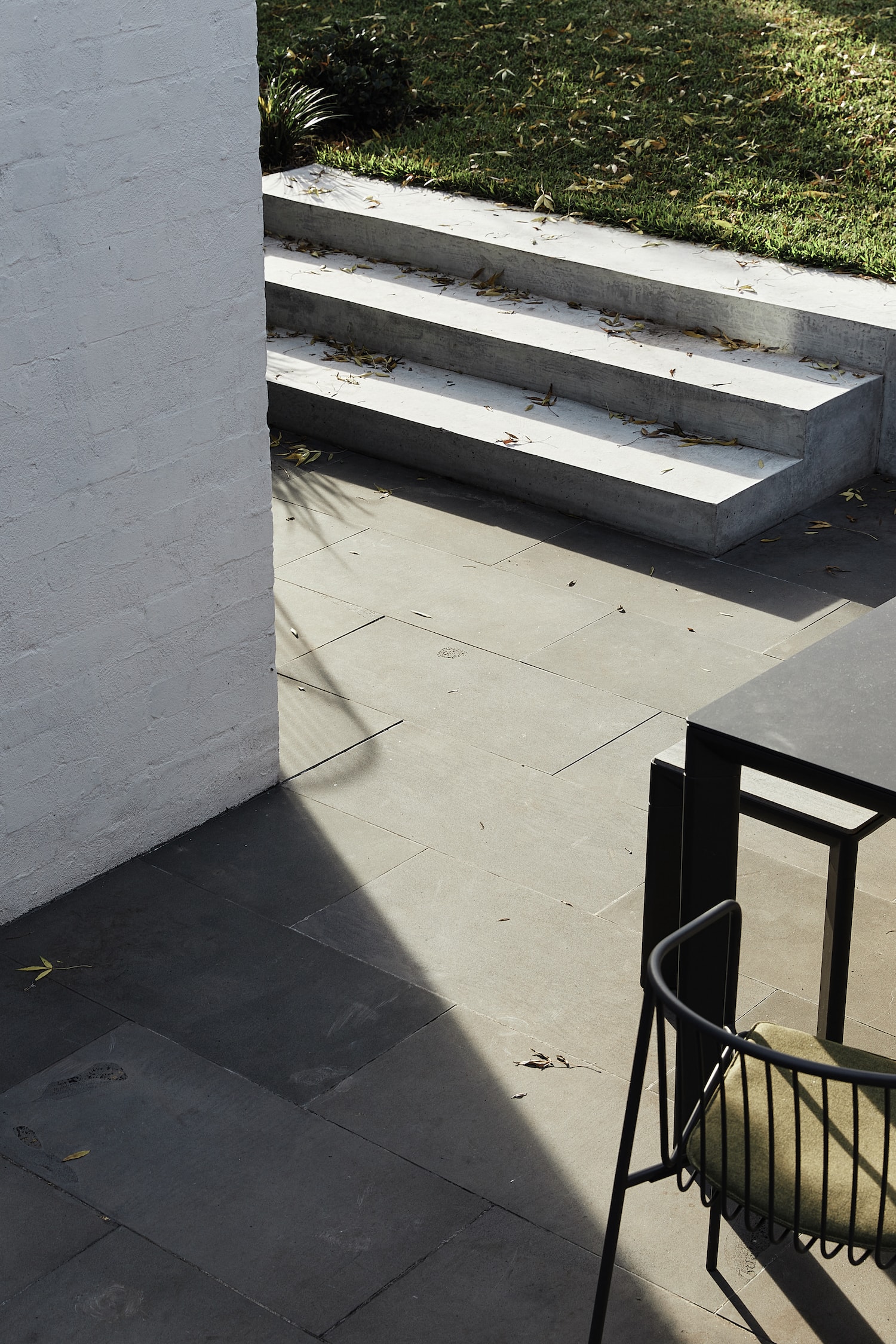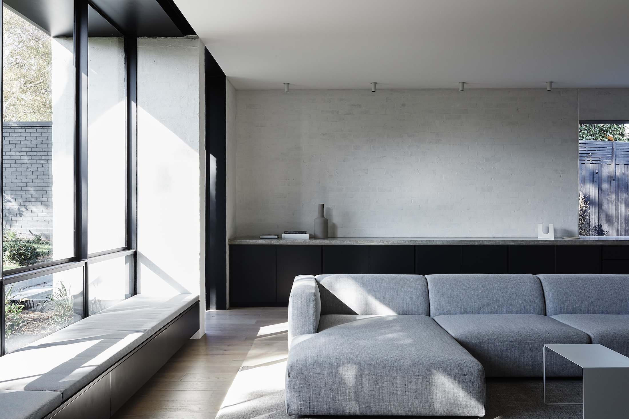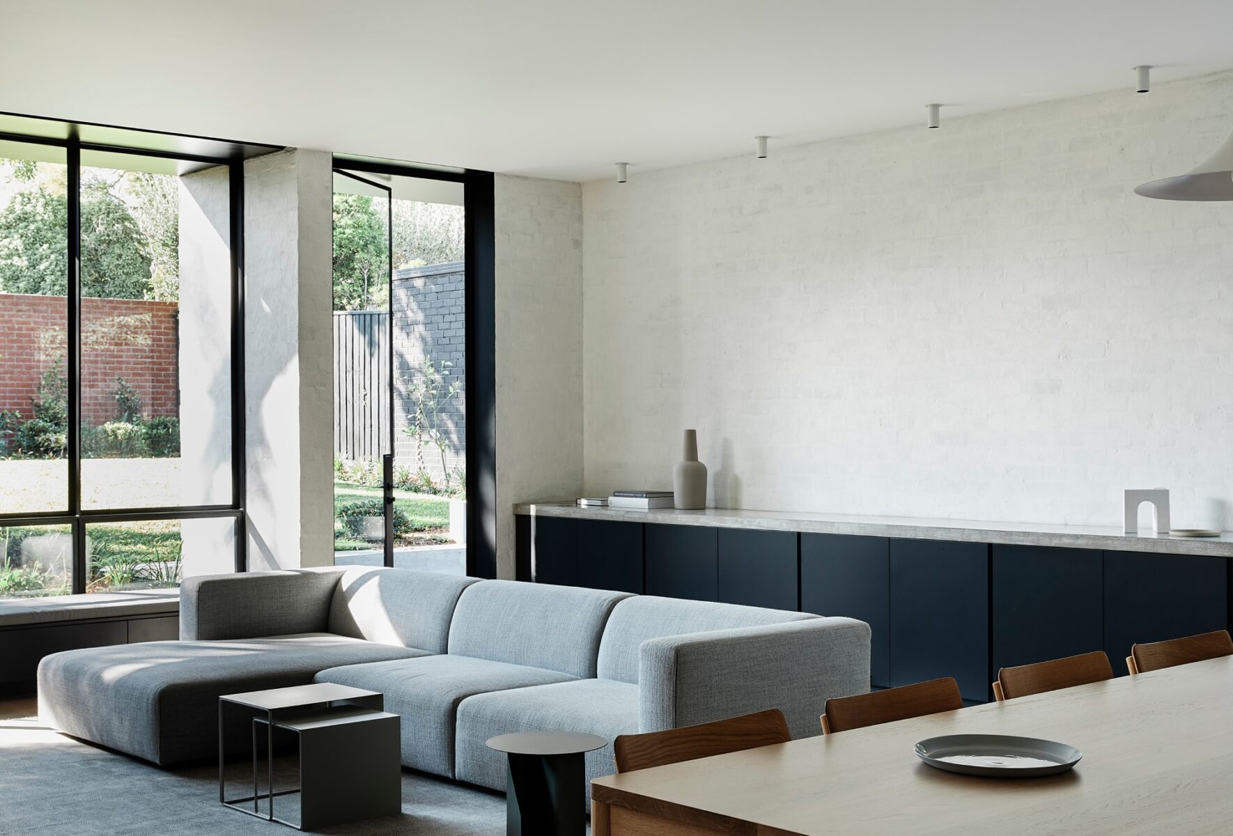 Hardscaping was limited to blur the ground interface, embedding the building into the landscape. Connection to the outdoors was further enhanced through an oversized kitchen splashback window which can be fully opened to the landscape beyond.