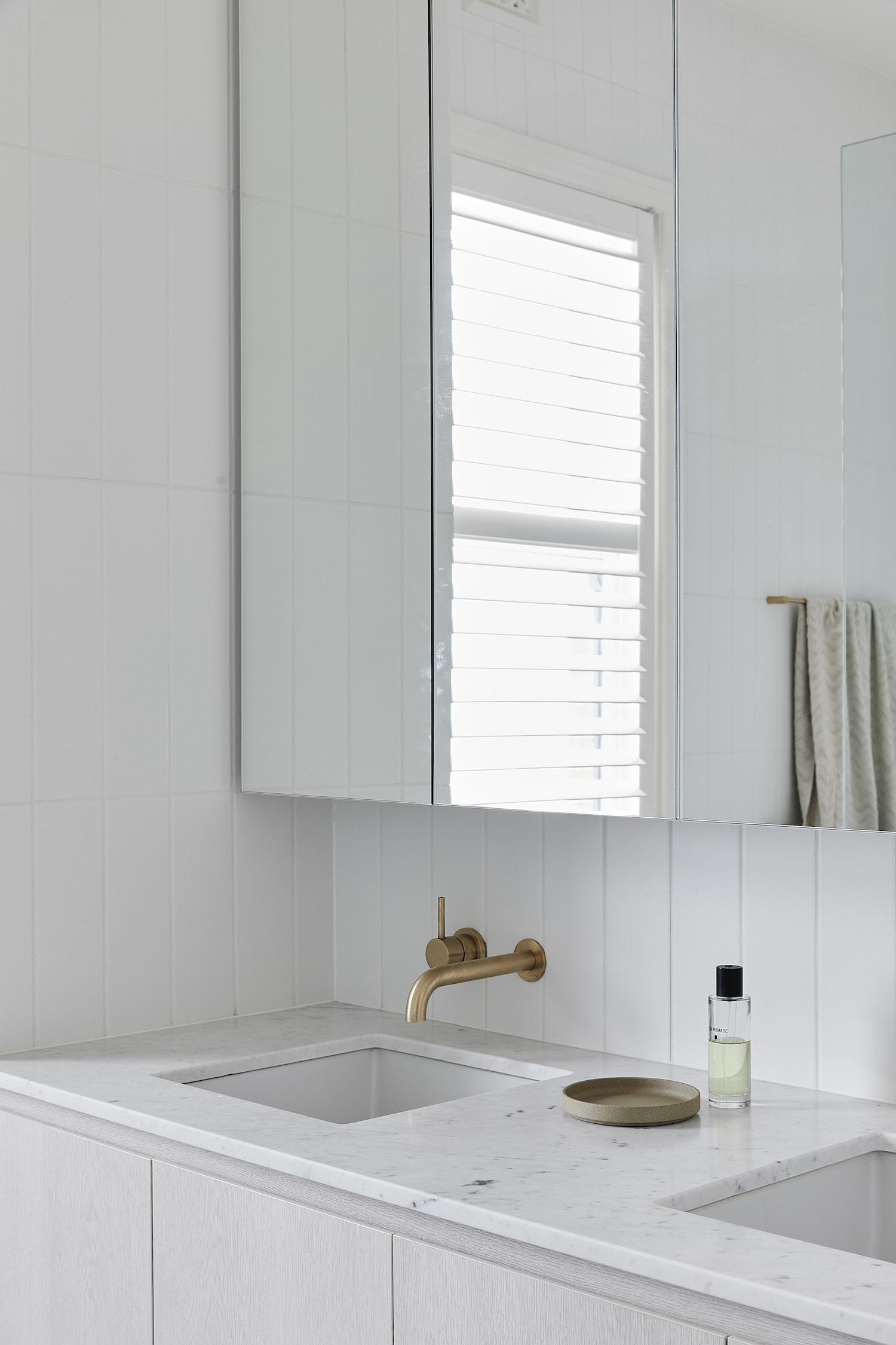 The minimally detailed rear addition contains the open plan kitchen, dining and living area, with elegant, subdued tones and raw materials that emphasise original period detailing and forms. A sensitive approach to materiality was taken, melding the old with the new and providing a consistent and enduring design language.