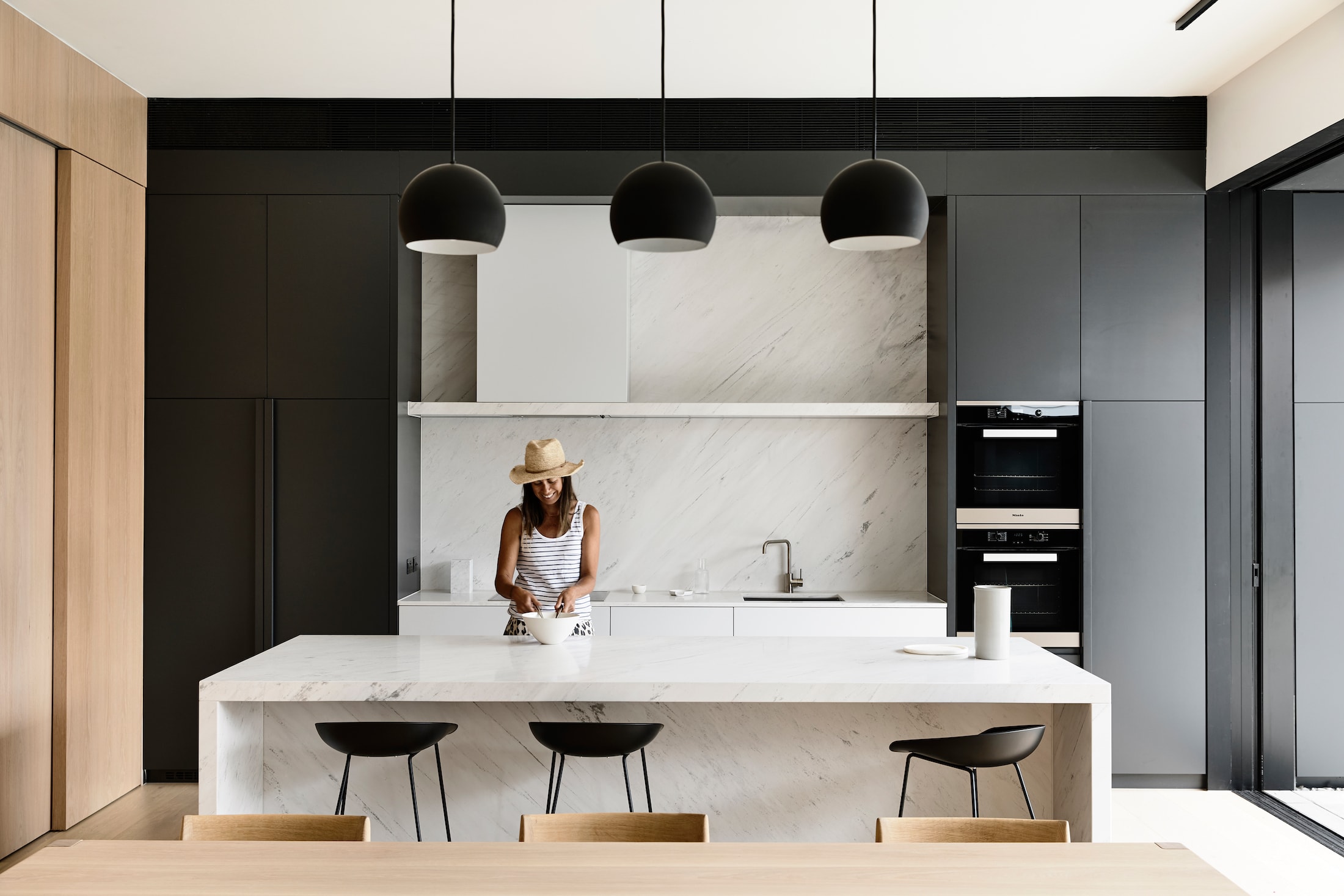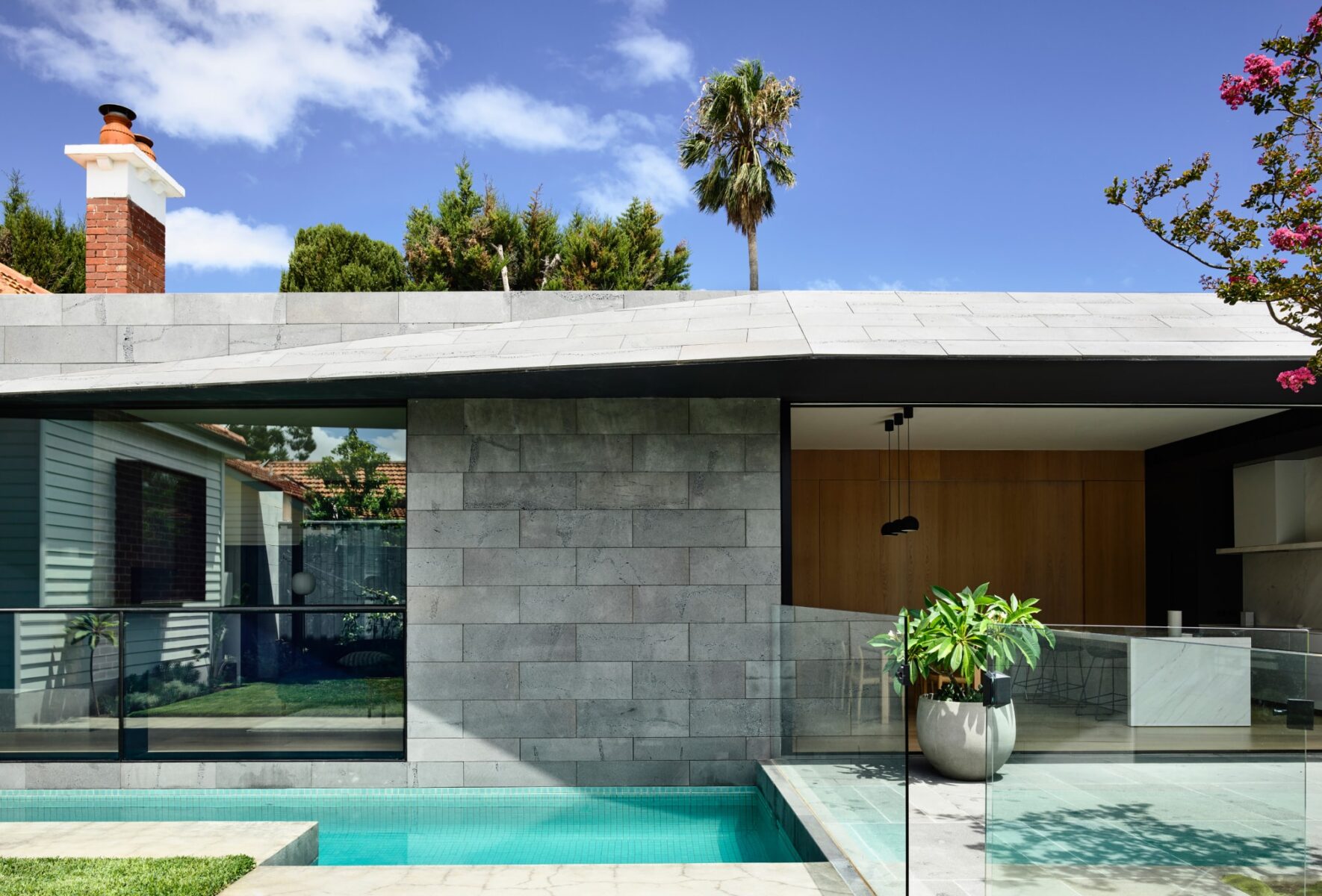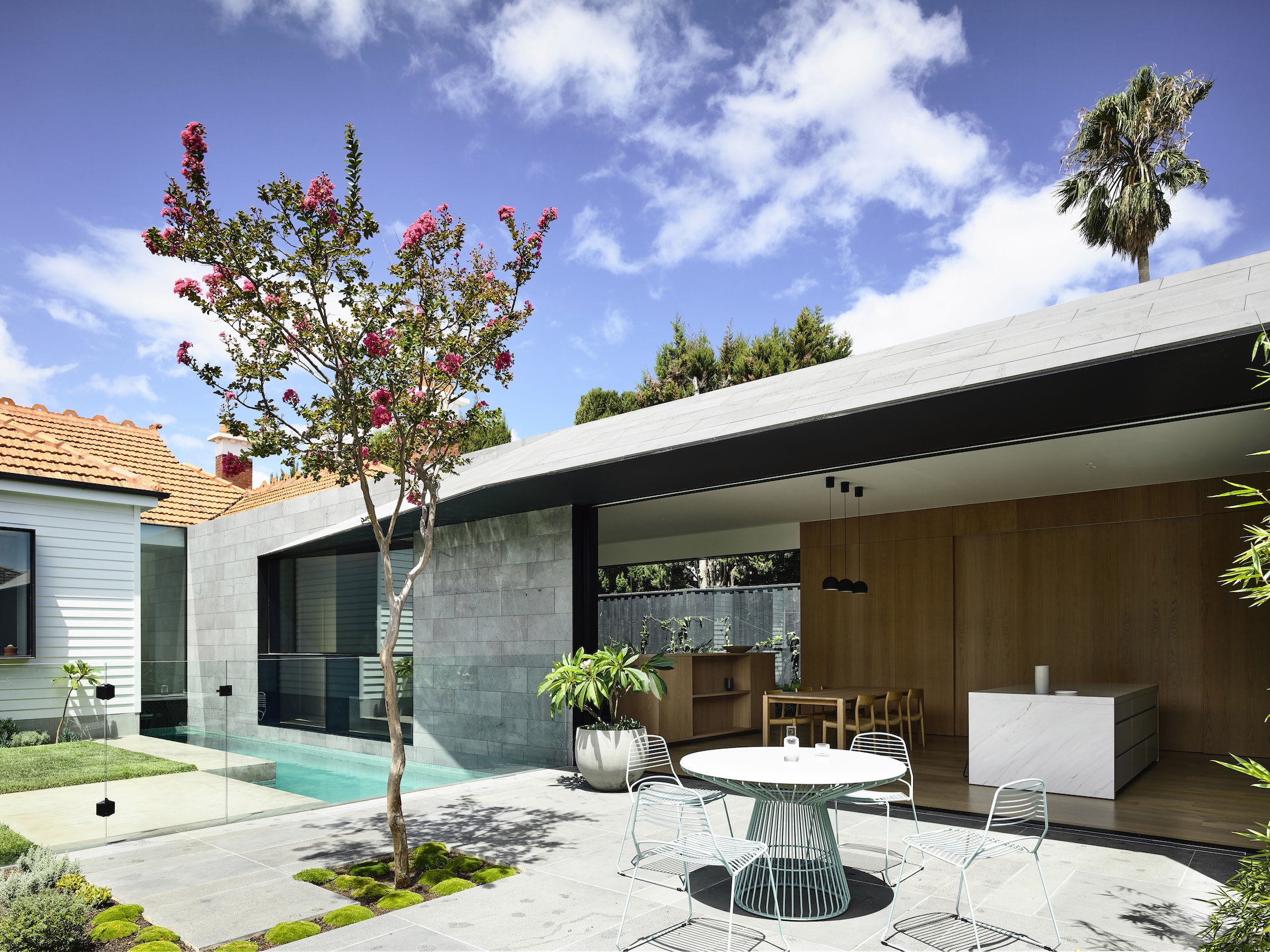 Providing open contemporary spaces with a delineation between inside and out was key, allowing effortless expansion and natural ventilation through the internal living and external entertaining spaces. A well-used lap pool saves space and aligns with the entrance hallway in the original part of the house – an unexpected gain from the shift in design thinking.
