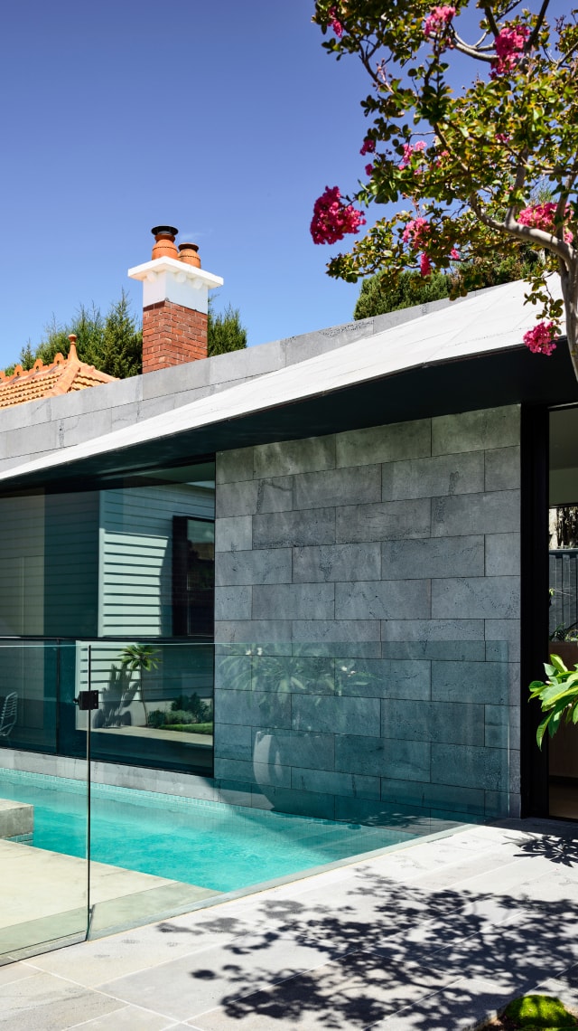The new bluestone-clad addition is built to both the southern and eastern boundaries. The addition is invisible from the street, sitting carefully underneath the existing tiled roof form. As a result of the reorientation, key living zones are now north facing and bathed in natural light. The external outlook is further enhanced by emphasising the significance of the existing surrounding trees.
