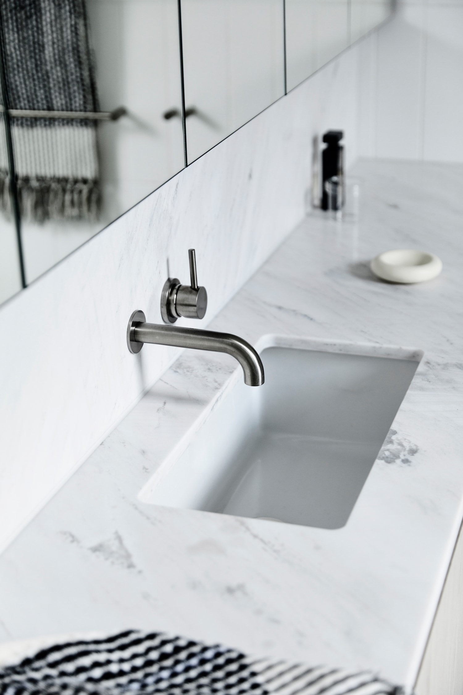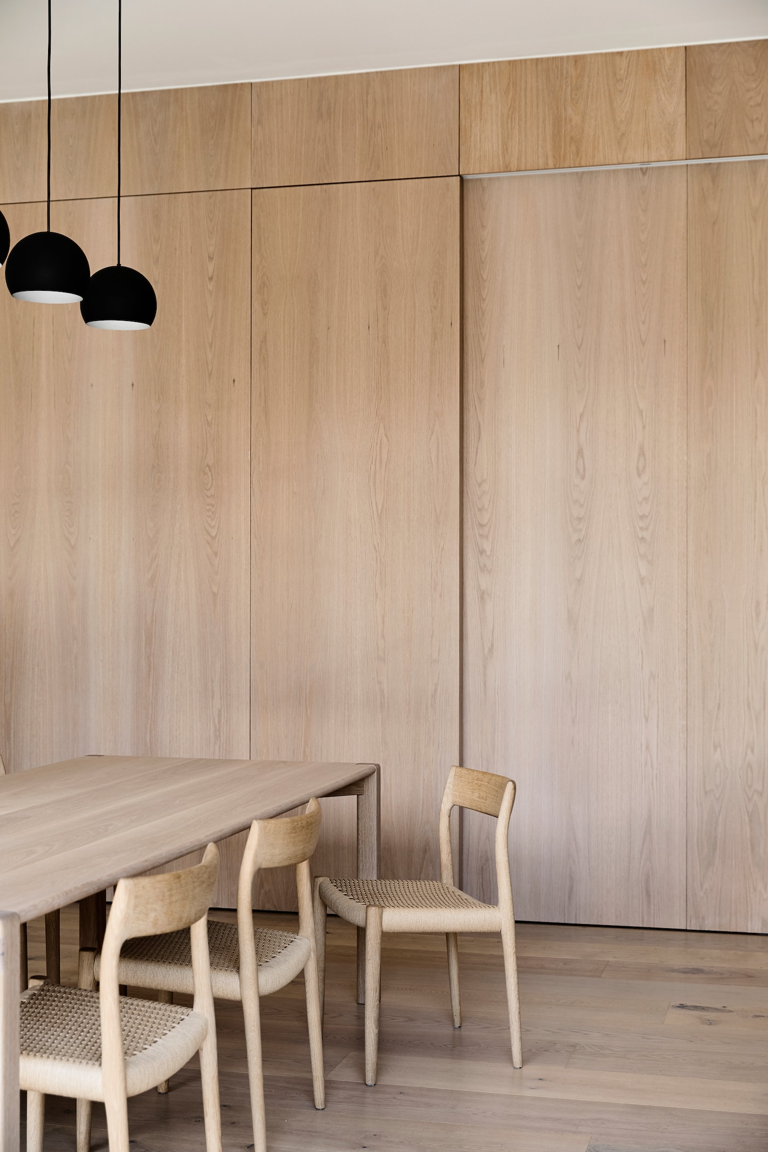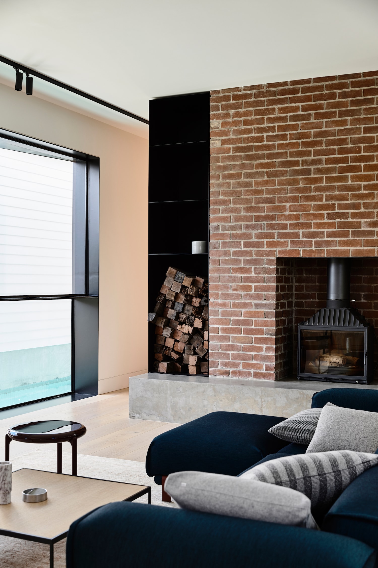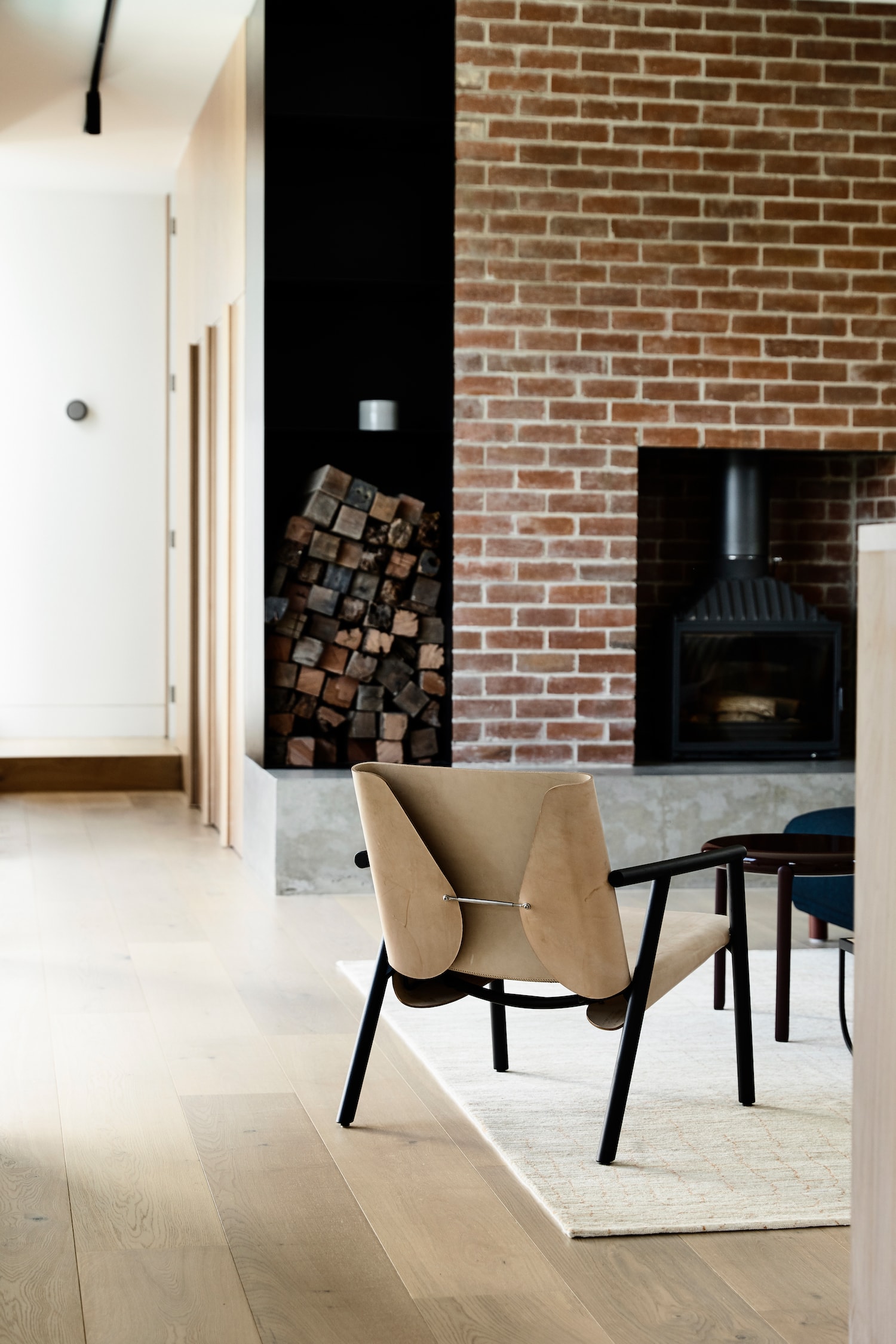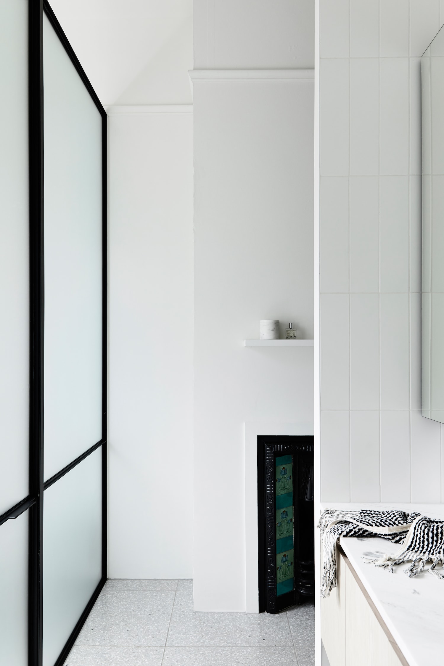 The existing home’s original Edwardian details have been preserved, such as the stained glass front door and the existing brick chimney, which now anchors the open living area. The design throughout is stripped of nonessential elements and organised around delicate and refined details using a tactile palette of bluestone, brick, and pale oak.