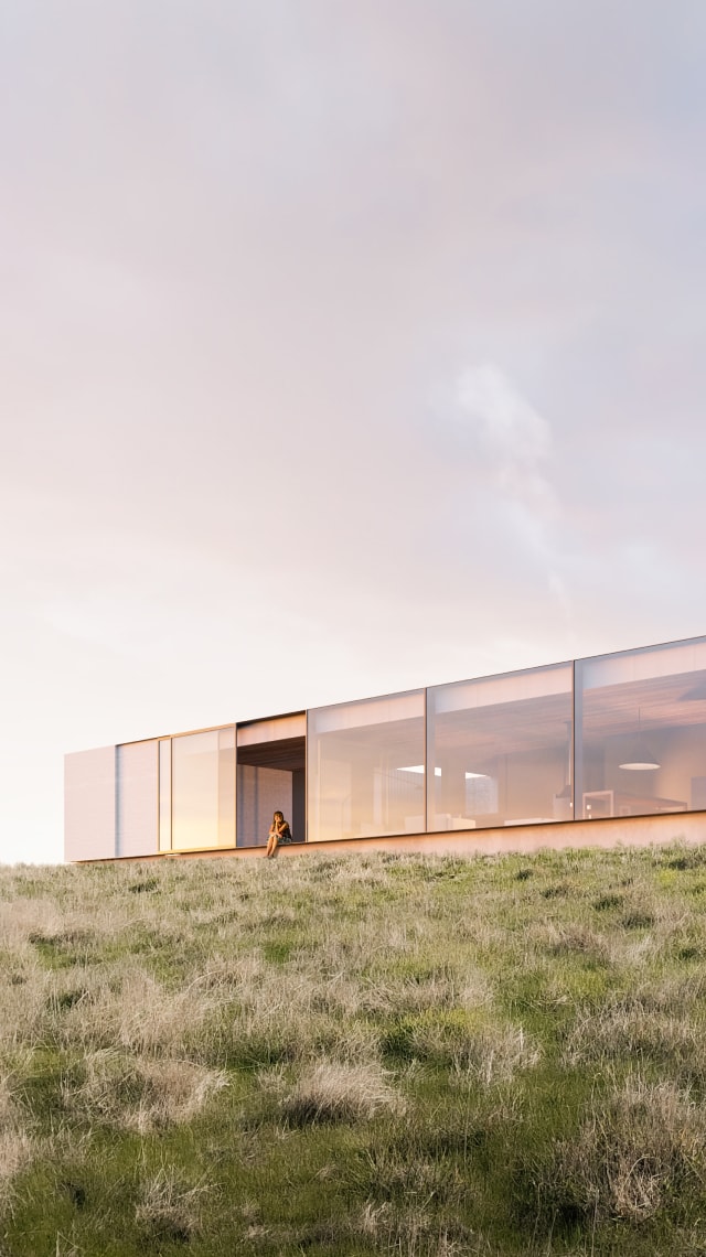 As you step down, you enter a living and dining zone with expansive views to the rolling hills beyond. From here you step down once again to the grassed area beyond. The untamed landscape goes straight up to the glazed interface, blurring the boundaries between inside and out.