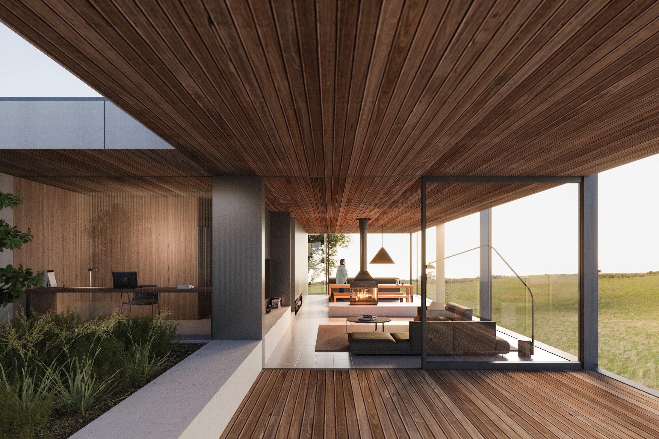 Guest accommodation is connected to the house via a covered deck which can be closed off to the elements when required. The house is both protective and immersive, standing ready for its owners to enjoy when they retire.