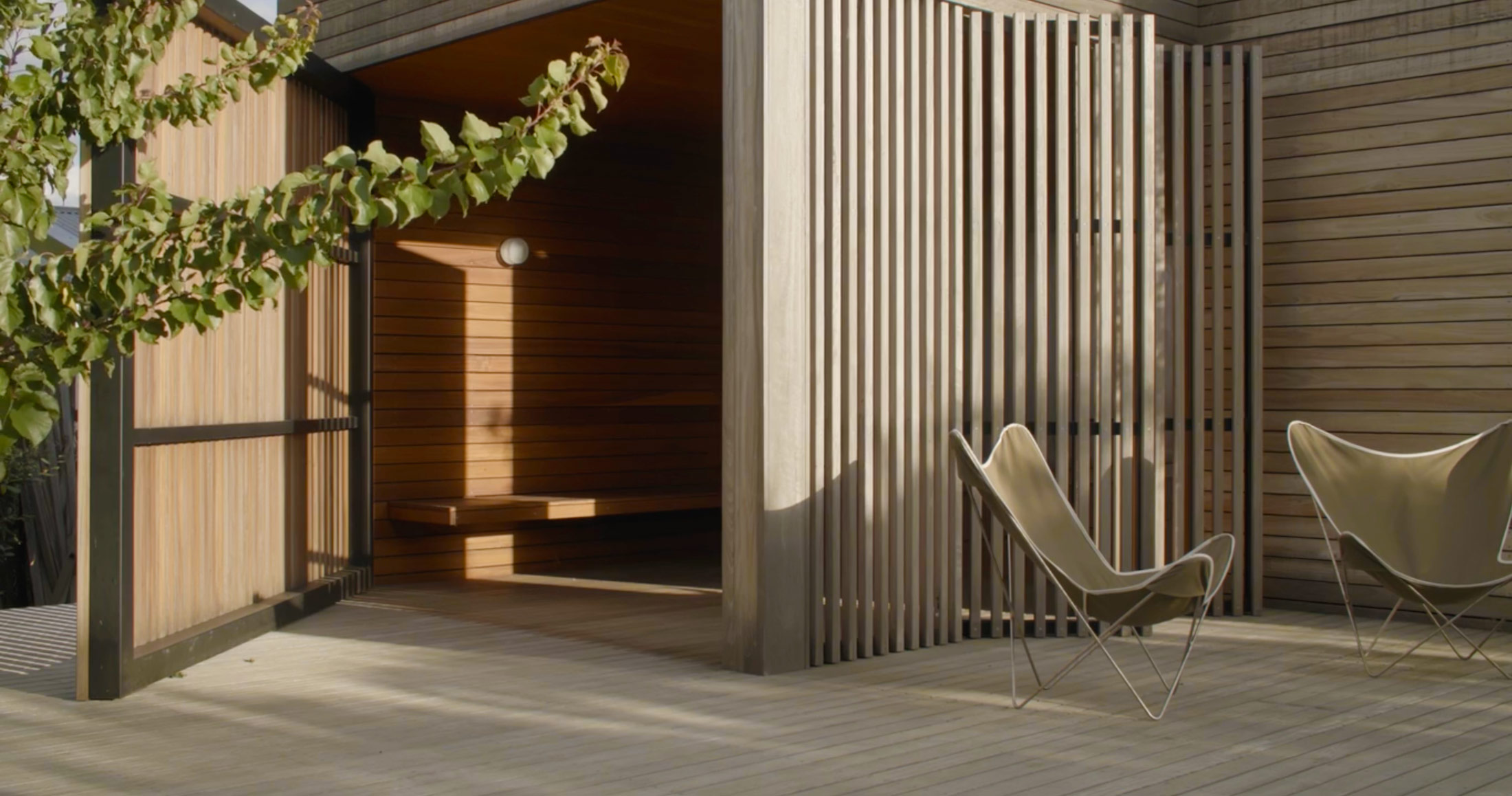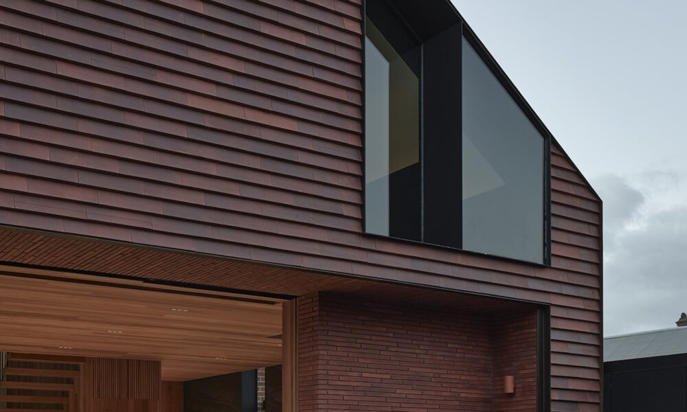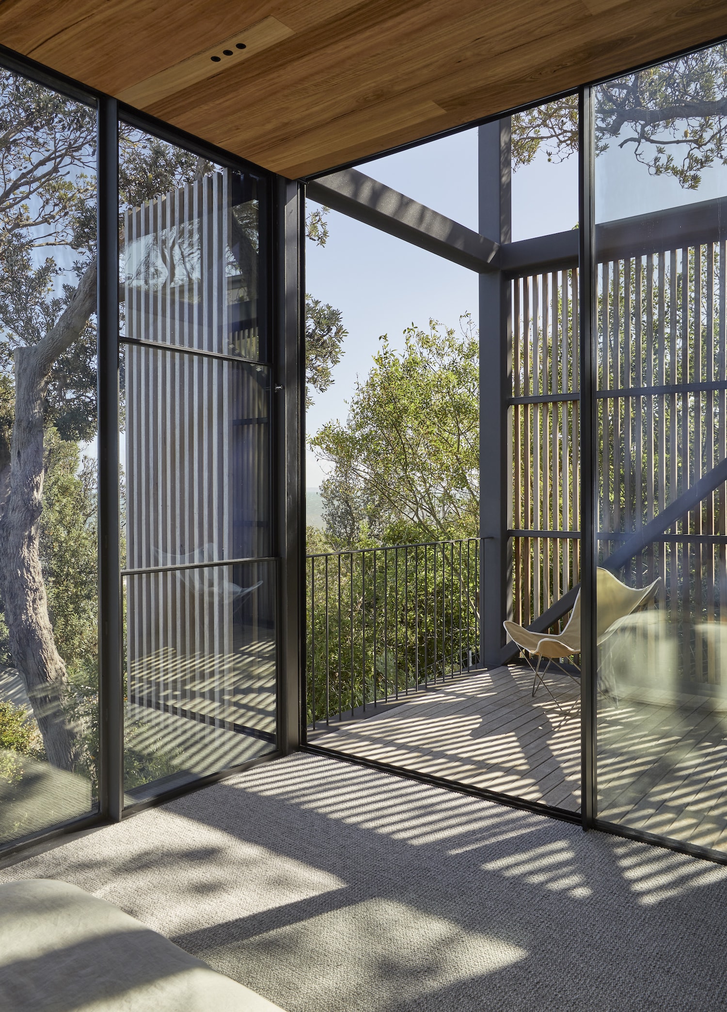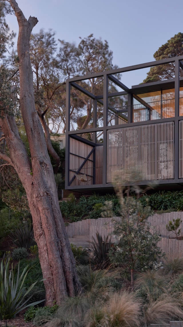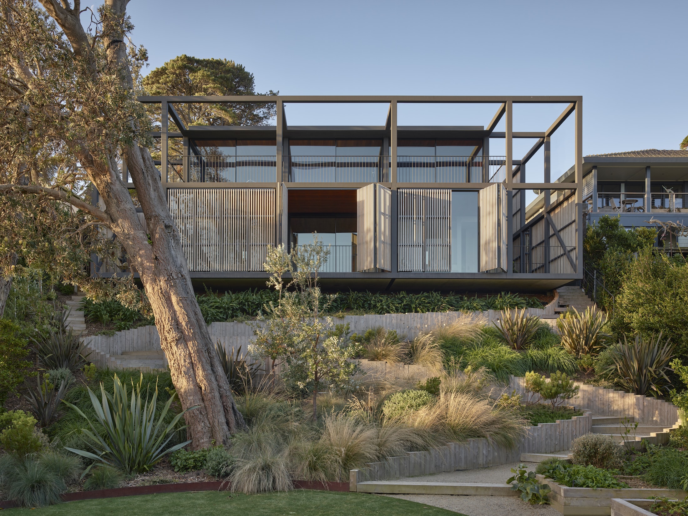 The house programme is organised around an expressed structural steel grid which anchors the building and ties it back into the site. It is clad entirely in timber, with bi-folding timber screens adding a dynamic element to the façade, enabling the house to open up when fully occupied and to close down when not in use.