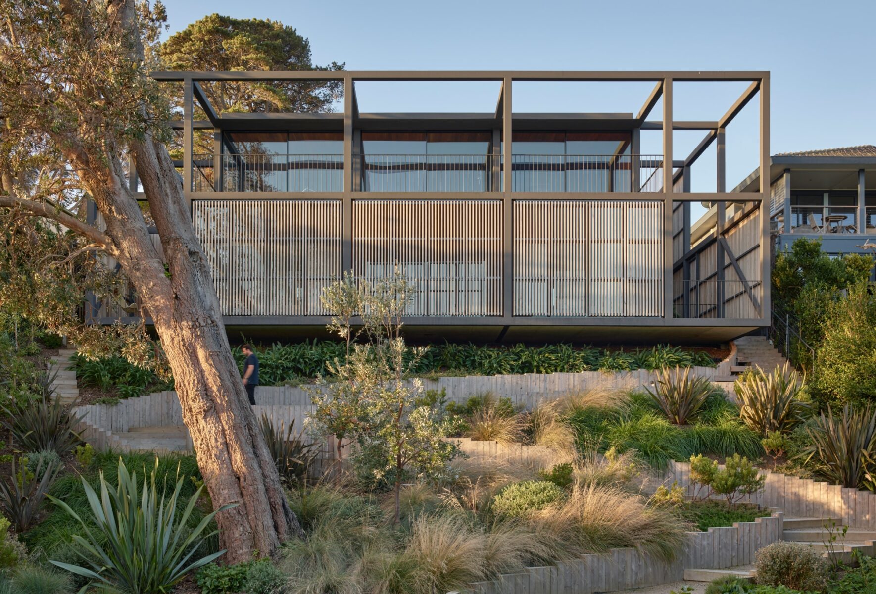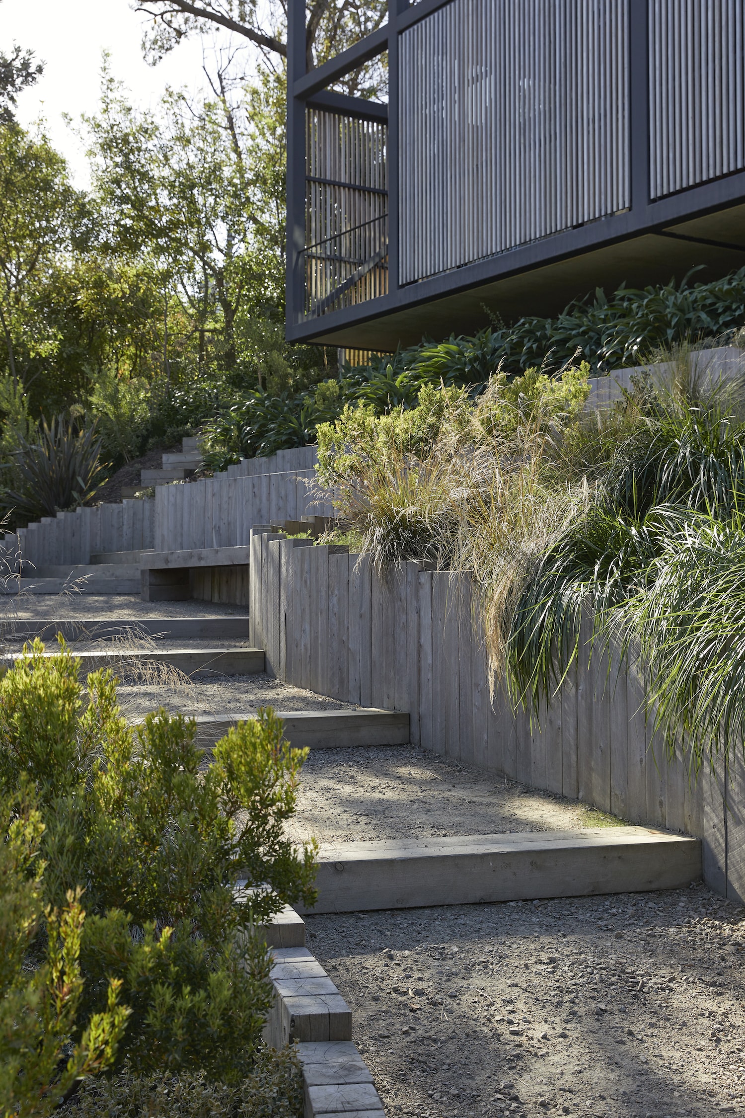 The house sits on the steepest section of the site, with two generous levels acting independently of one another. It is designed as an inter-generational holiday house, with a focus on the upper level of the home being comfortable when occupied only by a retired couple.