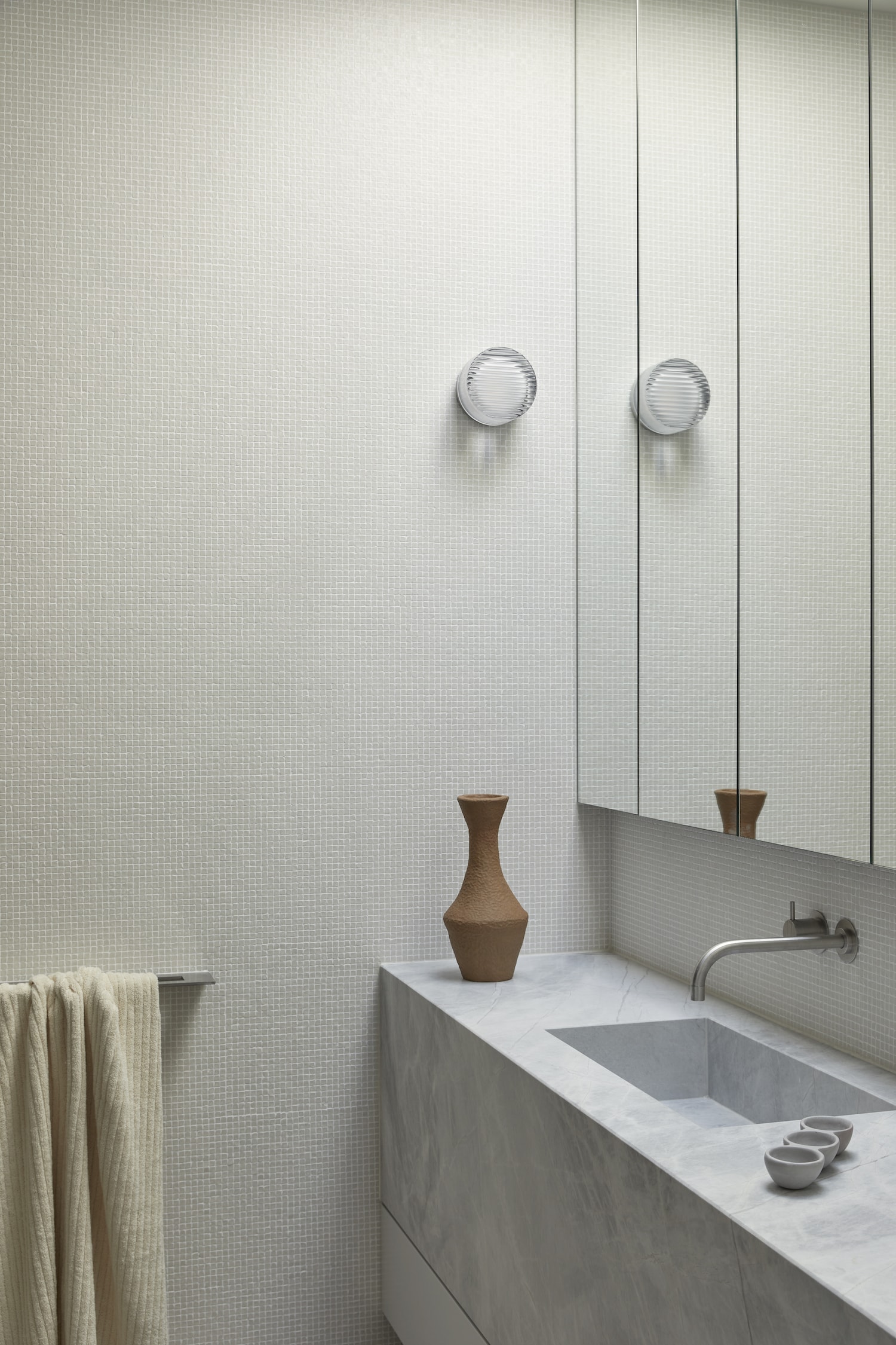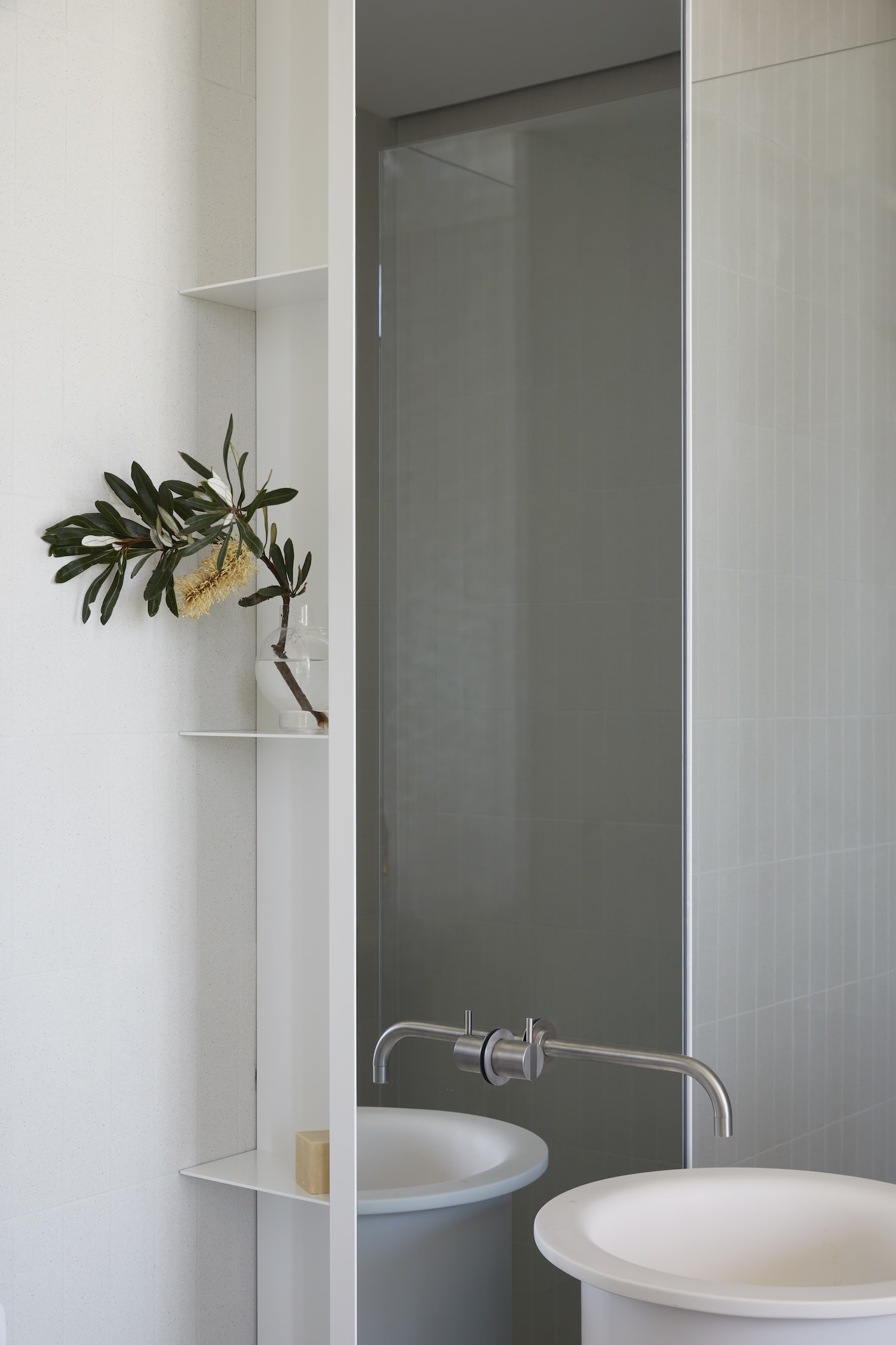 The upper level of the house contains the main bedroom and living zones, with materiality emanating the surrounding landscape, through the soft greens and silvers of the cabinetry, together with timber cladding.