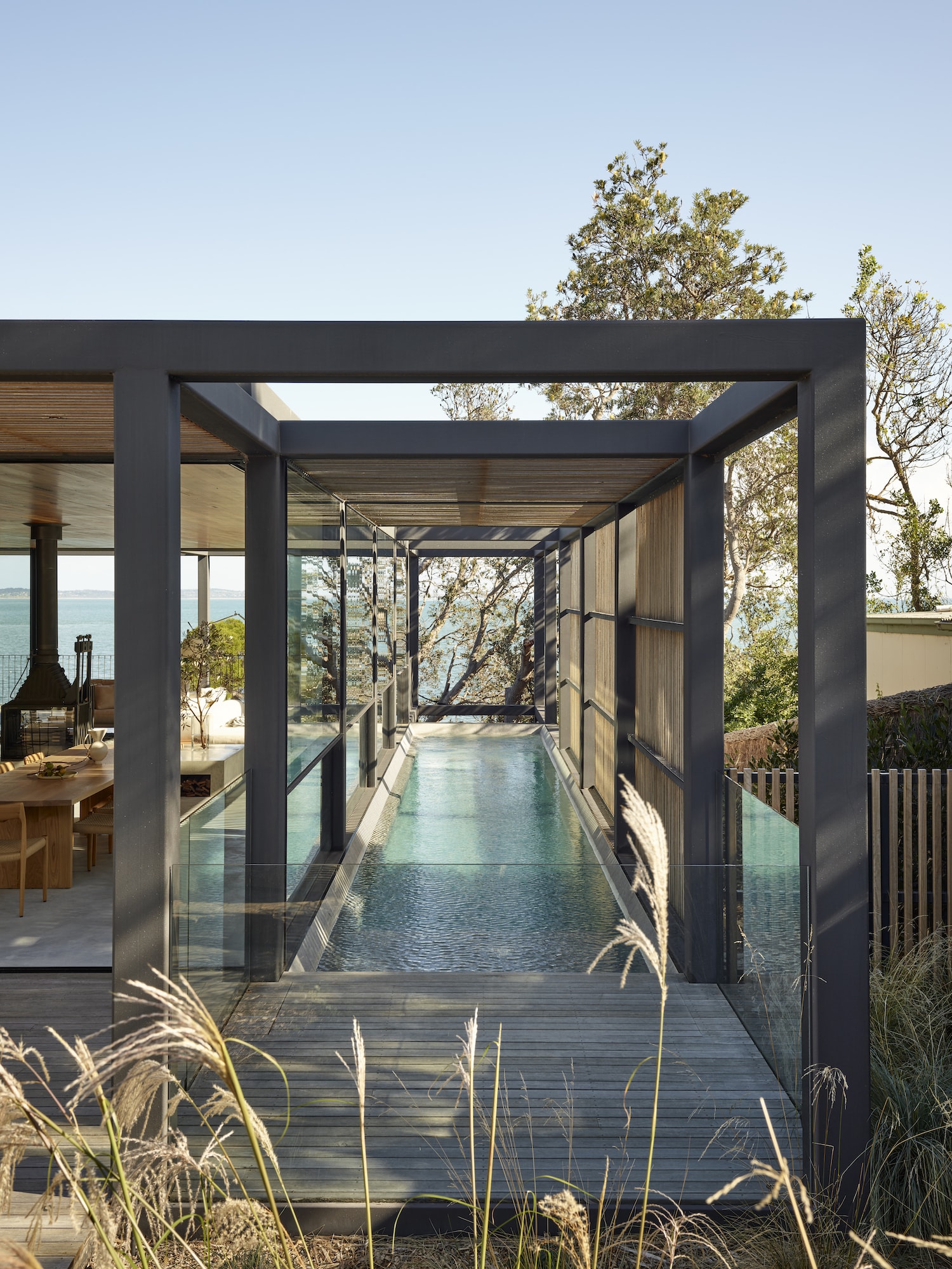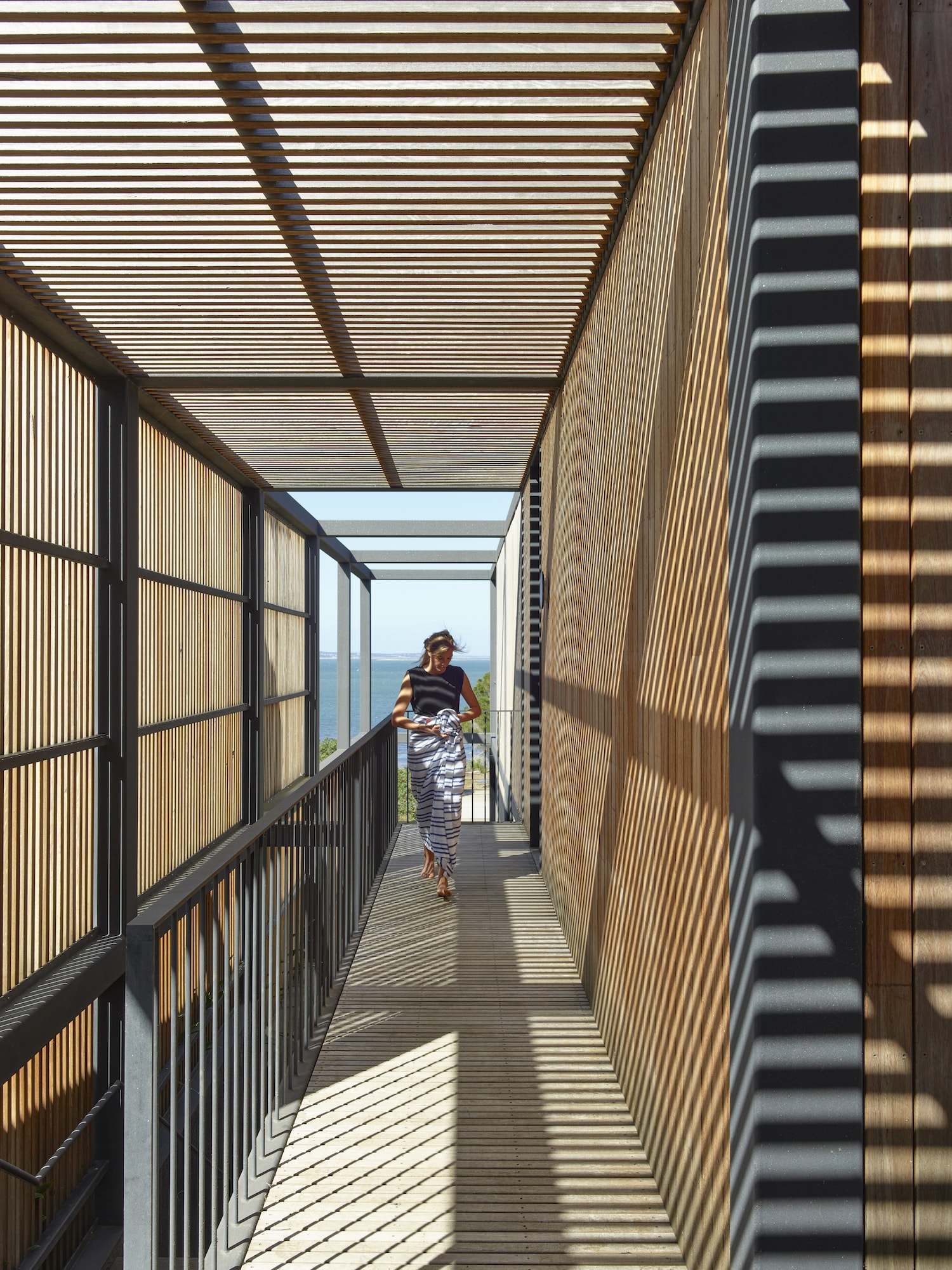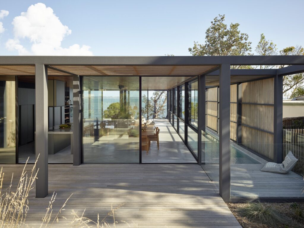 Continuing the journey, a covered breezeway links both levels and provides access to the rear garden and beach, allowing guests to experience the surrounding landscape as they descend. Arriving at the beach, a striking timber-clad boat shed hovers among the dunes and acts as an extension of the main dwelling.