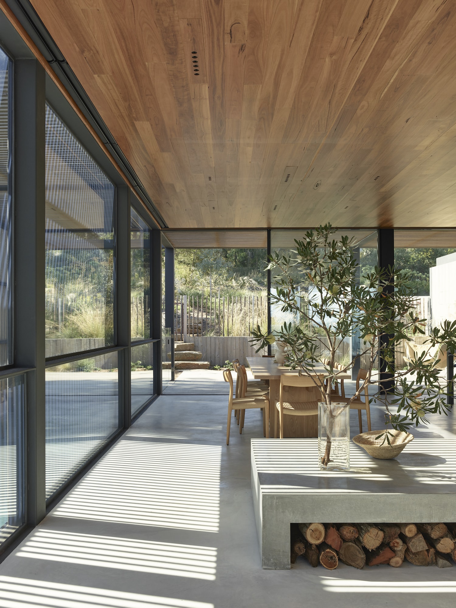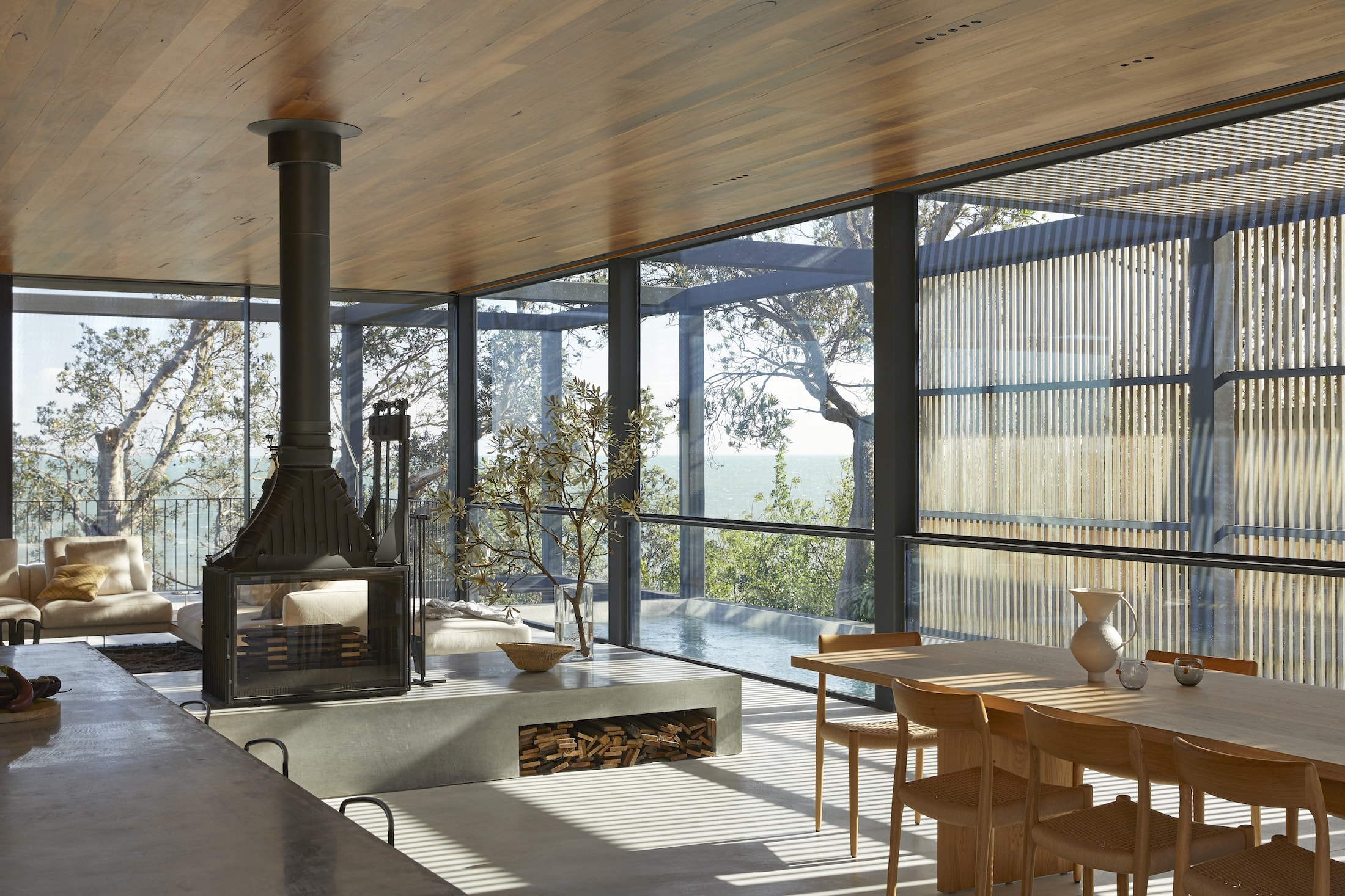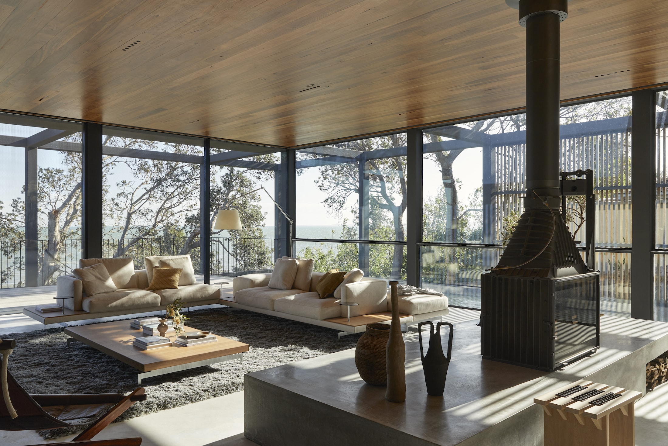 Continuing the journey, a covered breezeway links both levels and provides access to the rear garden and beach, allowing guests to experience the surrounding landscape as they descend. Arriving at the beach, a striking timber-clad boat shed hovers among the dunes and acts as an extension of the main dwelling.