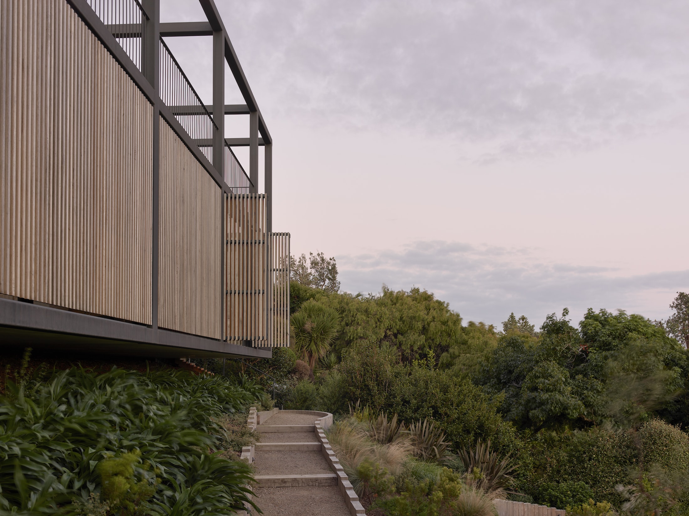 Entering on foot from the road affords a clear view straight over the building and to the views beyond, siting the building in the landscape as a singular object. A discreet entry bridge with timber battens leads to the front door.